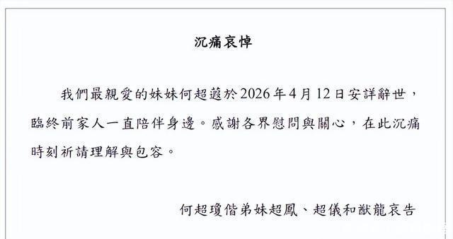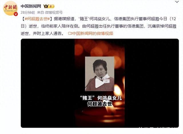 2026年4月12号,赌王二房女儿何超蕸走了,享年60岁。消息是姐姐何超琼发的,信德官网全变黑白。这是赌王17个儿女第三个过世的,家里人都很难过。 她爸何鸿燊2020年就走了,一共四个老婆生了17个孩子。超蕸是二太蓝琼缨生的第三个女儿。以前有人说她是隐形人,但后来发现她其实最能干活。父亲生前夸过她,说她是能帮上忙的,这话在圈子里传了好几年。 学历方面是加州佩珀代因大学毕业的,文凭拿了不少。后来还拿了港大的院士头衔,文化底子厚。2018年拿的学士,2024年拿了太平绅士。信德集团那些项目,像酒店交通房地产,她都是执行董事,实际负责一块业务。 平时很少见她穿裙子,多是西装头短发,打扮很清爽。性格应该挺闷的,不喜欢上镜,比起其他姐妹要低调很多。但真遇到事儿的时候,她总能顶住压力,不像只会花钱的那种。她生前还参加过慈善活动,算是个热心人。 这一辈子没结婚,也没小孩。虽然有人觉得豪门不传宗接代可惜,但她自己选的路。听说生前一直跟病作斗争,像是乳腺癌什么的细节没明说,反正身体一直不太好。她妈也是癌症走的,可能这病根子深。 走的时候儿女绕膝没有,但兄弟姐妹都在边上。四妹三弟都去了,场面虽然小也挺感人的。至于遗产这事儿,因为没孩子,肯定是由兄弟姐妹接手。毕竟她没孩子,钱最后还得留着家族用。 现在赌王的孩子们不多了,只剩没几个了。大姐超琼才六十多岁,还在干活。超英猷光之前也没了,加上超蕸就是仨。这家族能撑起来的人越来越少,以后咋维持是个大问题。 2025年火灾她还捐了一千万,挺有担当的。那时候还能看到,这次却突然走了,谁都没想到。信德官网已经变黑白了,消息也是实锤,不用猜来猜去。最后就提一嘴,剩下的事让家族内部处理吧,咱们外人也不清楚。